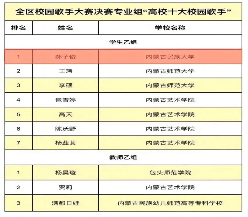 12月22日,由内蒙古自治区党委宣传部指导,内蒙古自治区教育厅、内蒙古自治区文学艺术界联合会联合主办,内蒙古艺术学院承办的“正青春·颂中华”2023年全区大学生艺术节校园歌手大赛决赛在呼和浩特市落下帷幕。我校荣获优秀组织奖,音乐学院学生郝子俊荣获第一名,并获得专业组“高校十大校园歌手”荣誉称号。