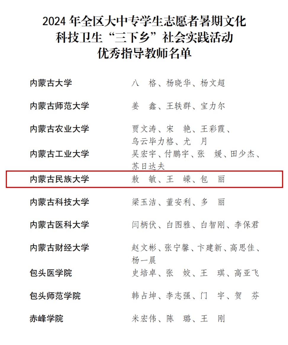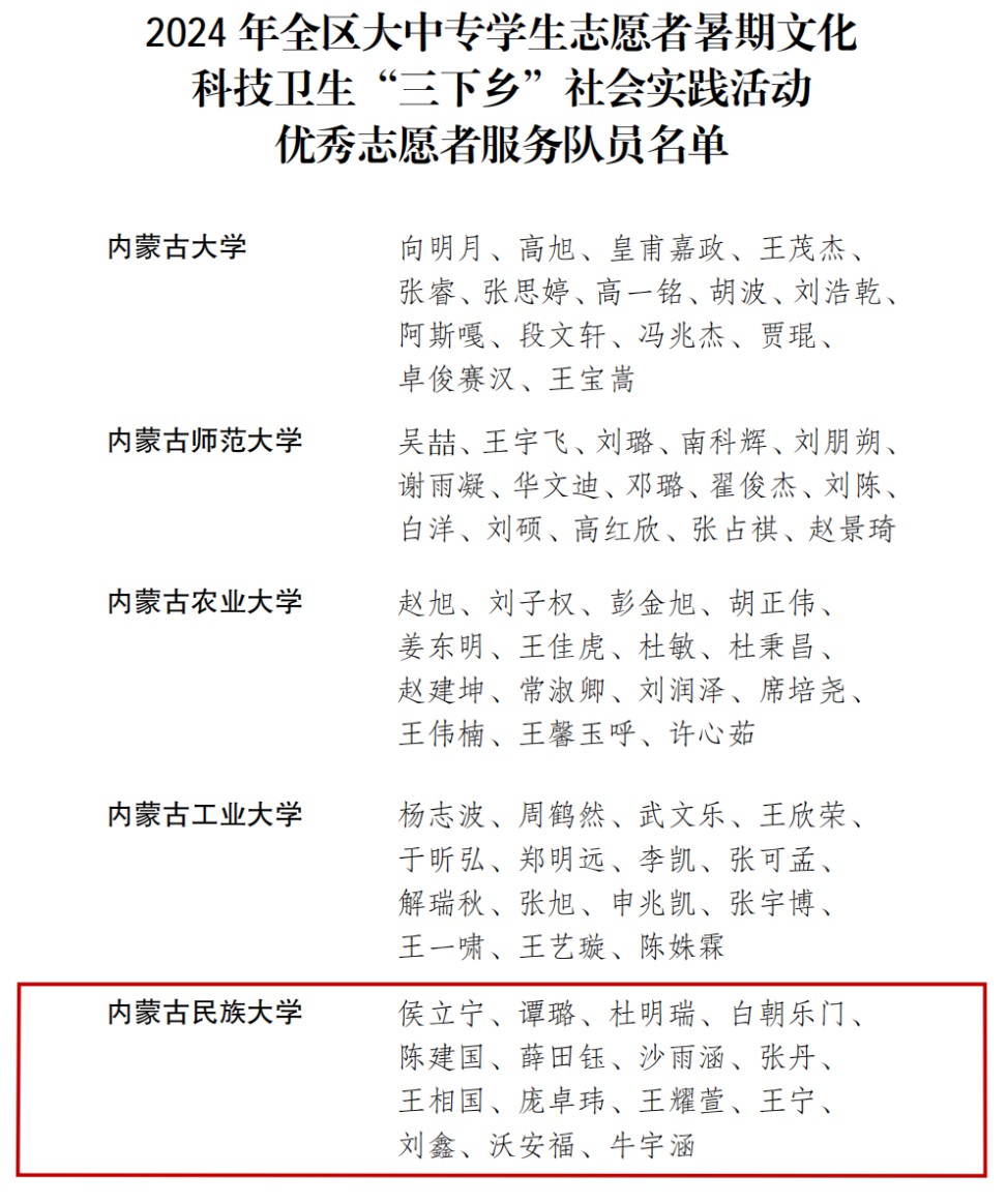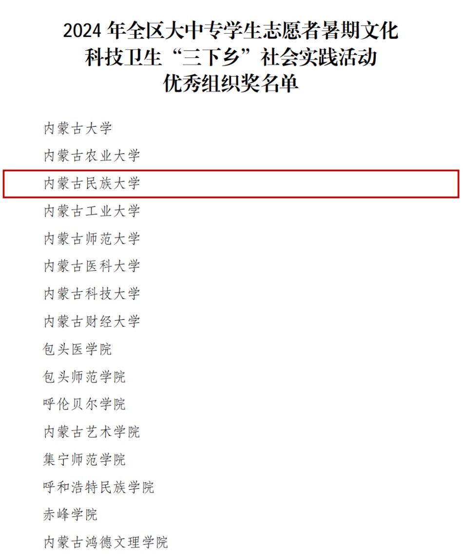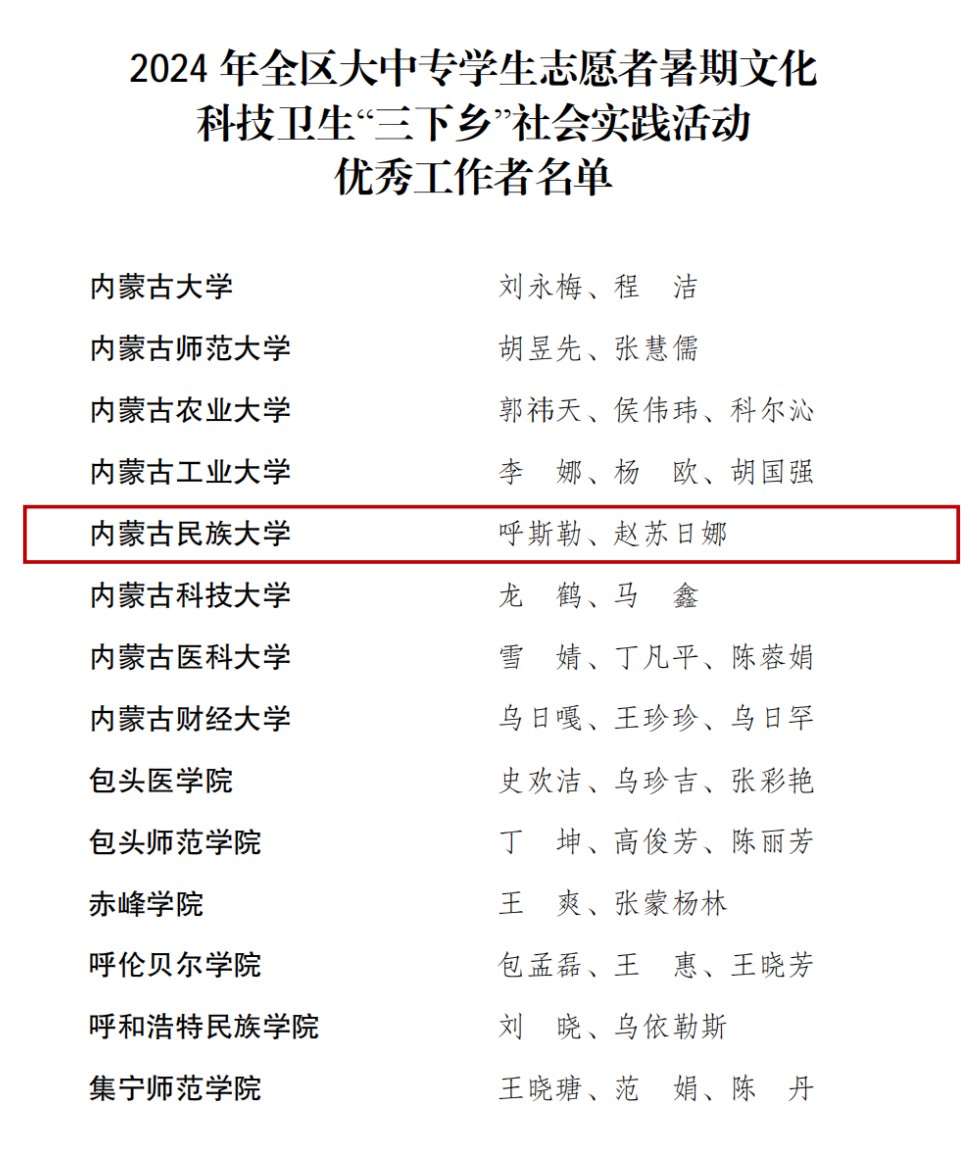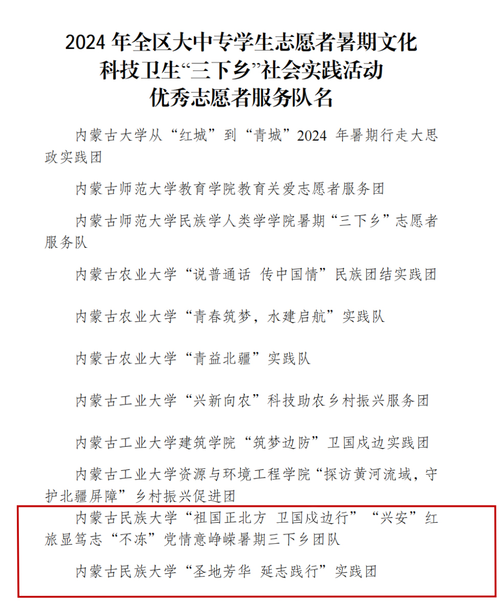 1月6日,由自治区团委、学联与自治区党委宣传部、文明办、教育厅联合开展的以“青春为中国式现代化挺膺担当”为主题的2024年全区大中专学生志愿者暑期文化科技卫生“三下乡”社会实践活动公布优秀组织奖、优秀志愿者服务队、优秀工作者、优秀指导教师、优秀志愿者服务队员名单。我校荣获“优秀组织奖”荣誉称号,“祖国正北方 卫国戍边行”“‘兴安’红旅显笃志”“‘不冻’党情意峥嵘”暑期三下乡团队、“圣地芳华 延志践行”实践团荣获“优秀志愿者服务队”荣誉称号,呼斯勒、赵苏日娜荣获“优秀工作者”荣誉称号,敖敏、王嵘、包丽老师荣获“优秀指导教师”荣誉称号,侯立宁、谭璐、杜明瑞、白朝乐门、陈建国、薛田钰、沙雨涵、张丹、王相国、庞卓玮、王耀萱、王宁、刘鑫、沃安福、牛宇涵同学荣获“优秀志愿者服务队员”荣誉称号。