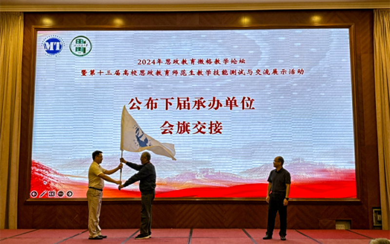 活动期间,我校马克思主义学院进行了2025年思政教育微格教学论坛暨第十四届高校思政教育师范生教学技能测试与交流展示活动承办权的申请汇报和竞选。经全体参会教师现场投票和中国教育技术协会微格教学专业委员会审议,我校成功获得承办权。中国教育技术协会微格教学专业委员会理事长孟宪凯向我校授旗。
