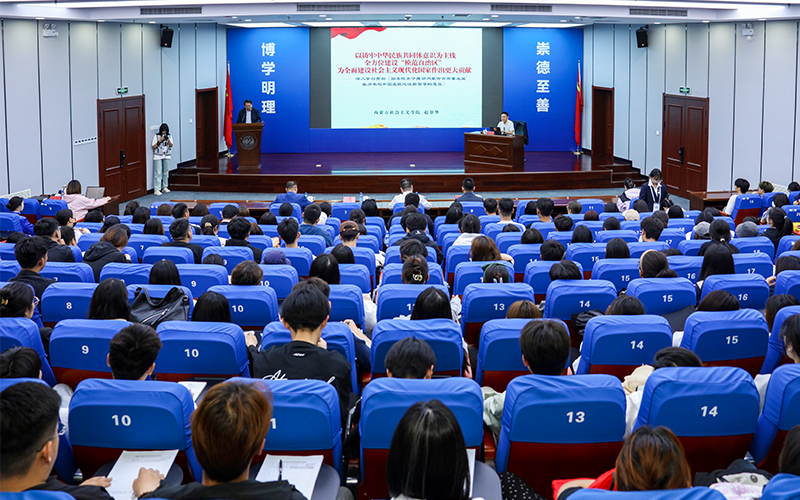 赵景华以“以铸牢中华民族共同体意识为主线 全方位建设模范自治区 为全面建设社会主义现代化国家作出更大贡献”为题,围绕贯彻落实《国务院关于推动内蒙古高质量发展奋力书写中国式现代化新篇章的意见》,从“坚持生态优先绿色发展,贯彻新发展理念、构建新发展格局,以两件大事为主抓手推进内蒙古现代化建设”三个方面详细解读了《意见》精神以及如何更好完成内蒙古的两件大事。整场报告内容丰富、立意深远、鼓舞人心,让到场师生对《意见》和全方位建设模范自治区有了更加深入的理解。