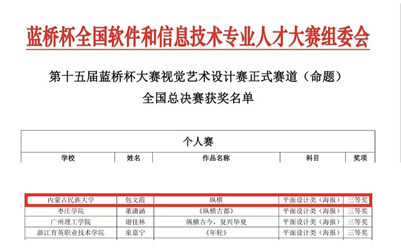 近日,第十五届蓝桥杯大赛视觉艺术设计赛落下帷幕。我校美术与设计学院2022级视觉传达设计2班包文霞同学获得第十五届蓝桥杯大赛视觉艺术设计赛道国家级三等奖。