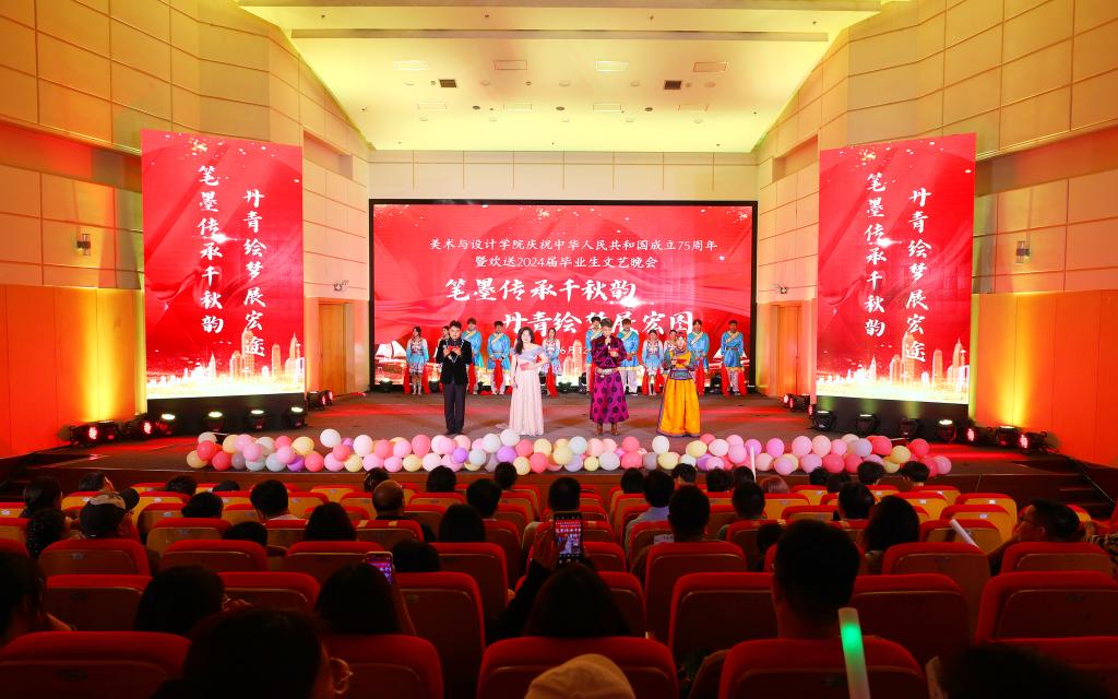6月12日晚,美术与设计学院在西拉木伦校区逸夫楼音乐厅举办“笔墨传承千秋韵 丹青绘梦展宏图”——庆祝中华人民共和国成立75周年暨欢送2024届毕业生文艺晚会。校党委书记赵东海,校党委委员、副校长裴志利,校党委委员、副校长、统战部部长王百涛,校党委委员、宣传部部长、党政办公室主任孙林,校党委委员、组织部部长付向阳莅临晚会现场,学生处、团委、美术与设计学院负责人及学院师生300余人共同观看演出。