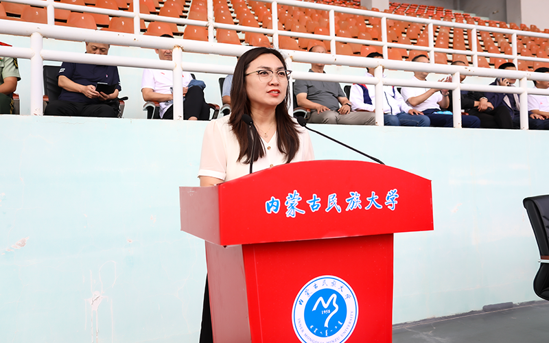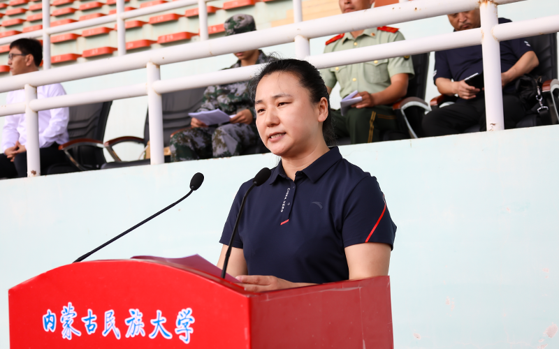 学生处副处长、军训大队部副教导员徐晓影宣读《内蒙古民族大学2024级新生军训工作先进集体、先进个人评选办法》