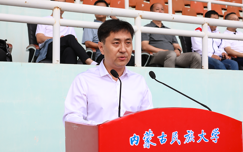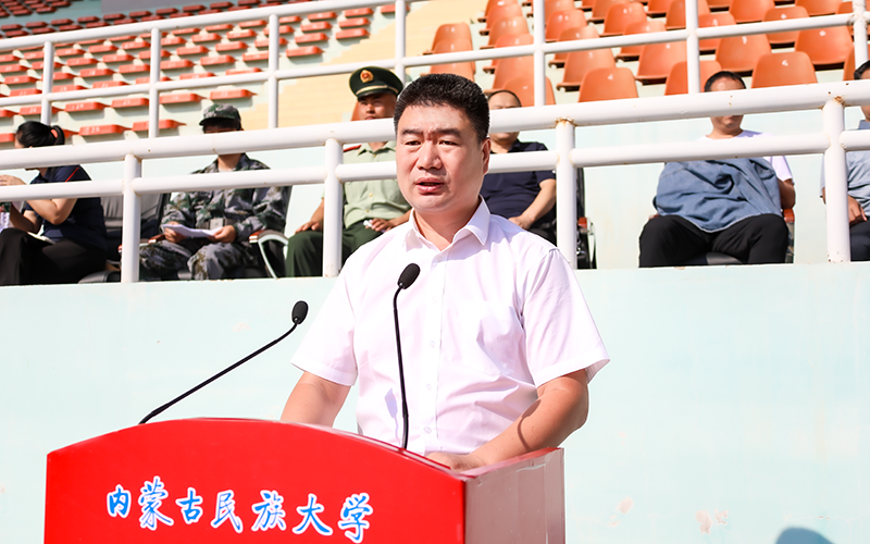 学生处副处长、军训大队部副大队长郝建辉宣读《内蒙古民族大学2024级新生军训工作方案》