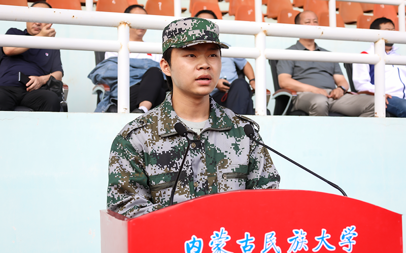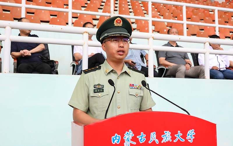 武警通辽支队教官刘春成代表承训部队发言。全体军训教官将按照学校部署,认真组训、按纲施训、严格带训,提高全体新生的身体素质和军事素养。