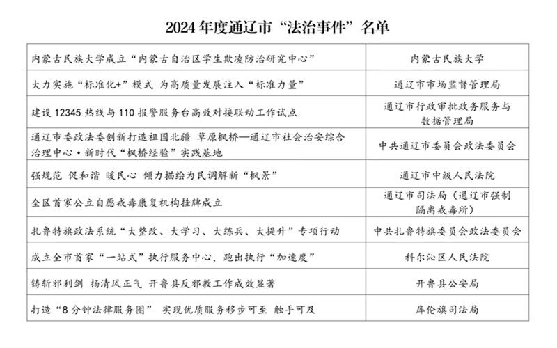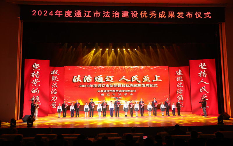 为深入学习贯彻习近平新时代中国特色社会主义思想,全面贯彻习近平法治思想,深入宣传贯彻党的二十大和二十届二中、三中全会精神,深入贯彻落实习近平总书记关于坚持和发展新时代“枫桥经验”的重要指示精神,展示新时代法治通辽建设新成就,进一步增强全市干部群众法治意识,为更好地服务推进五大任务和全方位建设模范自治区“两件大事”凝聚法治力量,2月21日,通辽市委政法委在辽河剧院举办“法治通辽 人民至上—— 2024年度通辽市“法治事件”“法治人物”“法治为民创新案例”发布仪式。由我校推荐的“内蒙古民族大学成立内蒙古自治区学生欺凌防治研究中心”荣获2024年度通辽市“法治事件”。