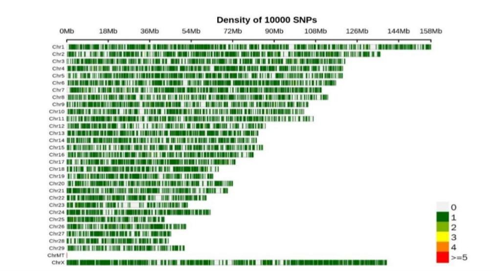 研发团队广泛采集样本,涵盖东起呼伦贝尔、西至阿拉善的12个地区共1000余份蒙古牛样本,以及三河牛等4个以蒙古牛为母本育成的品种及类群共200余份样本。团队对其中具有代表性的900余头肉牛进行深度重测序,精选出1万个高多态性SNP位点,均匀分布于所有染色体,覆盖肉牛体貌特征、生长、肉质、繁殖等重要性状功能区。