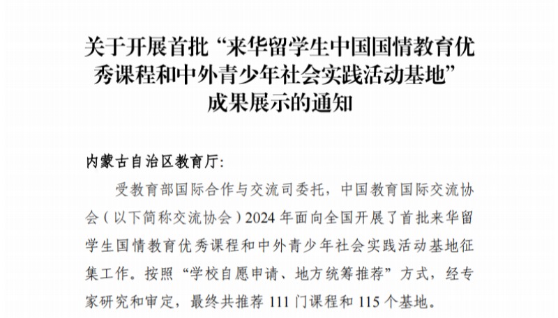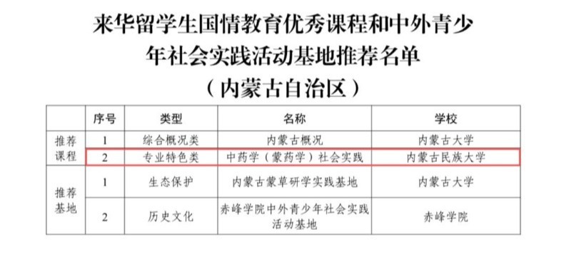 近日,中国教育国际交流协会公布了首批“来华留学生中国国情教育优秀课程”与“中外青少年社会实践活动基地”推荐名单,全国共有111门课程和115个基地入选。我校申报的《中药学(蒙药学)社会实践》课程成功入选,是自治区入选的唯一一门专业特色类课程。