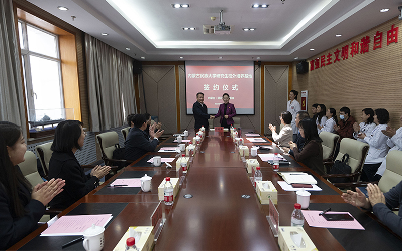 为进一步深化校院合作,推动医学教育、科研与医疗服务协同发展,3月26日下午,内蒙古民族大学与通辽市人民医院签署战略合作协议。校党委委员、副校长裴志利,通辽市人民医院党委书记金洁,通辽市卫生健康委员会党组委员、副主任李志云等领导出席签约仪式。学校教务处、研究生处(院)、临床医学院主要负责人;通辽市人民医院领导班子成员、研究生导师、教研室主任、教研秘书以及科教部工作人员参加签约仪式。杜艳秋主持会议。