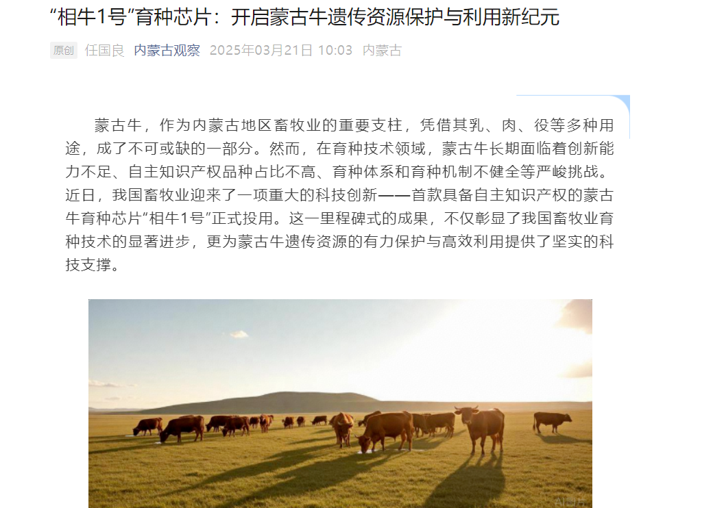 肉牛育种创新团队聚焦肉牛种业振兴,长期与内蒙古科尔沁肉牛种业股份有限公司、通辽市京缘种牛繁育有限责任公司等企业合作建设了肉牛基因组大数据人工智能基因组大数据分析平台和肉牛遗传评估与肉牛细胞资源利用平台,并成功开发出针对蒙古牛遗传资源开发与利用的10k液相芯片“相牛1号”,该成果具有广泛的应用前景,被光明网、科学网、内蒙古日报等多家主流媒体报道、转载。