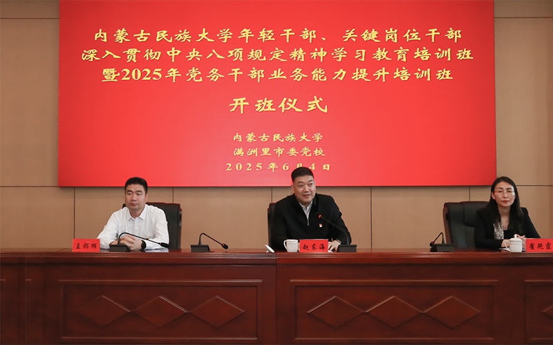 为深入学习贯彻习近平新时代中国特色社会主义思想,扎实开展深入贯彻中央八项规定精神学习教育,6月4日,学校党委举办的年轻干部、关键岗位干部深入贯彻中央八项规定精神学习教育培训班暨2025年党务干部业务能力提升培训班在满洲里市委党校开班。校党委书记赵东海,校党委副书记王烨辉,满洲里市委党校常务副校长翟艳霞,校党委委员、宣传部部长孙林,校党委委员、组织部部长付向阳出席开班式。
