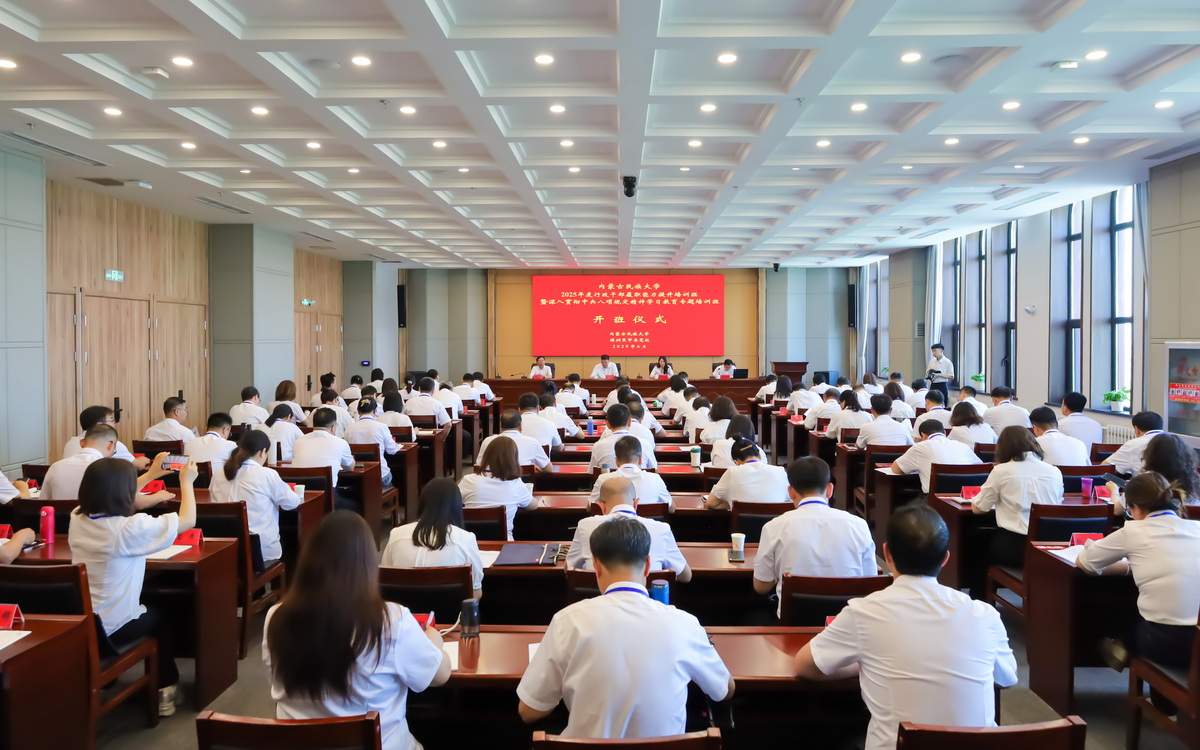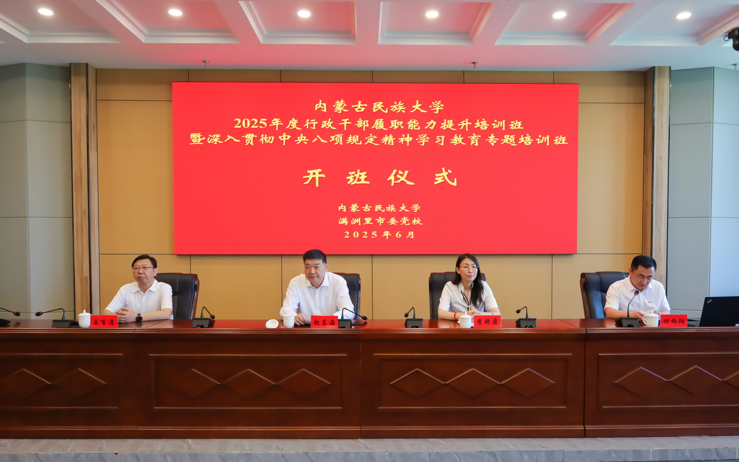 为深入学习贯彻习近平新时代中国特色社会主义思想,扎实开展深入贯彻中央八项规定精神学习教育,6月25日,内蒙古民族大学2025年度行政干部履职能力提升培训班暨深入贯彻中央八项规定精神学习教育专题培训班在满洲里市委党校开班。校党委书记赵东海,校党委委员、副校长王百涛,满洲里市委党校常务副校长翟艳霞参加开班仪式。校党委委员、组织部部长付向阳主持开班仪式。