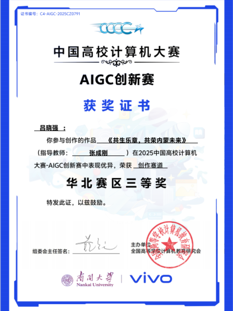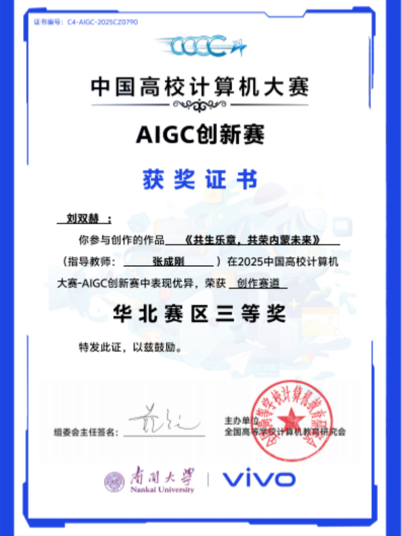 近日,2025中国高校计算机大赛—AIGC创新赛圆满落幕,我校计算机科学与技术学院2022级网络工程3班刘双赫、吕晓强等同学组成的联合参赛团队凭借出色的AIGC作品,在创作赛道中斩获华北赛区三等奖。